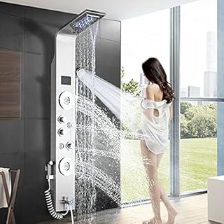 ALENARTWATER ステンレススチール LED シャワー パネル タワーシステム LED レインフォール ウォーターフォール シャワーヘッド ディスプレイ レイン マッサージ ジェット付き つや消しニッケル