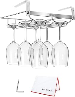 HULISEN ワイングラスホルダー 棚厚さ調節可能 ワイングラスハンガー 吊り下げ 穴あけ不要 ねじ止め 18/8ステンレス ー グラス拭きタオル付き (2レーン)