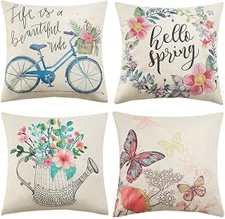 Anickal スプリング枕カバー 20 x 20インチ 4枚セット 春の装飾 ハロースプリングリース 自転車 蝶 装飾スロー枕カバー 春 ホームファームハウスの装飾用