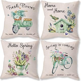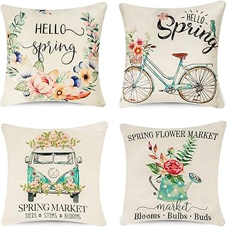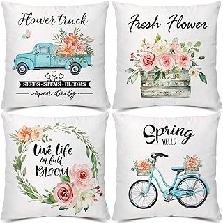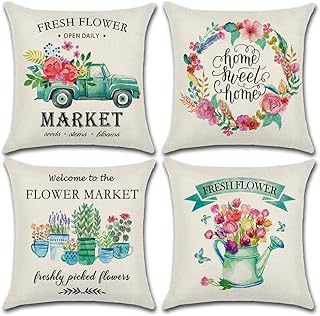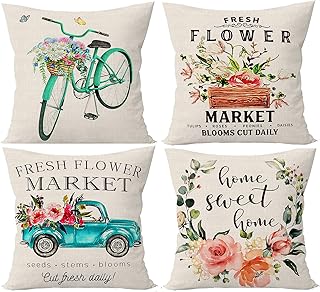 SIBOSUN スプリング枕カバー 18 x 18インチ 4枚セット 装飾用フローレット ファームハウス スロー枕カバー - フラワーマーケット 自転車 車 コットンリネンクッションカバー 春のホームデコレーション用