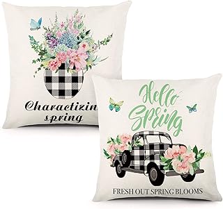 YGEOMER スプリング枕カバー 18 x 18インチ 2枚セット バッファロー格子柄 農家 トラック 農場 フレッシュフラワー 装飾スロー枕カバー 春 家の装飾または新築祝いのギフトに