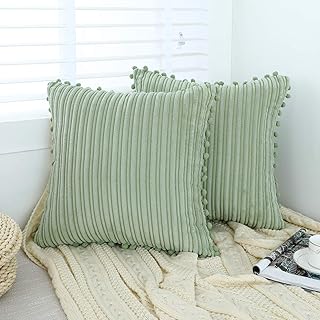 Oirpro グリーン枕カバー 20 x 20インチ ポンポン付き コーデュロイ農家 ボーホーアクセント 装飾スロー枕カバー カウチ ベッド ソファ用