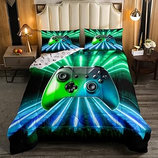 Erosebridal グリーン ブルー ゲームパッド 掛け布団セット ゲームプレーヤー 寝具セット フルサイズ モダン ゲーマー ゲーム キルト 掛け布団 ネオン トリッピー 羽毛布団セット 子供 男の子 女の子 ティーン ヤングマン ルーム 装飾