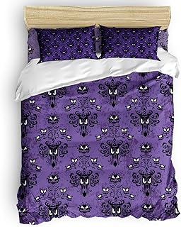 布団カバーセット フルサイズ - ハロウィンの幽霊マンションデザイン 4ピース寝具セット 装飾的 子供/ティーン/大人向け ベッドシート1枚 キルトCiver 枕カバー2枚付き パープルブラック