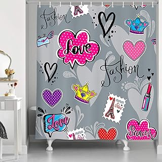 Happy Valentine's Day シャワーカーテン かわいいファッション ピンク ハート ローズ リップスティック エッフェル塔 グレーファブリックシャワーカーテンセット モダングレー ファッションクロス バスカーテンセット シャワーフック付き 69X70インチ