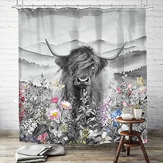 SVBright ハイランド カウ シャワーカーテン ブラック ホワイト 幅60x長さ72インチ 花柄 草 ウエスタン マウンテン ファームハウス ガーデン 面白い ロングホーン ブル フック12個パック ポリエステル 防水生地 バスルーム 浴槽パネル
